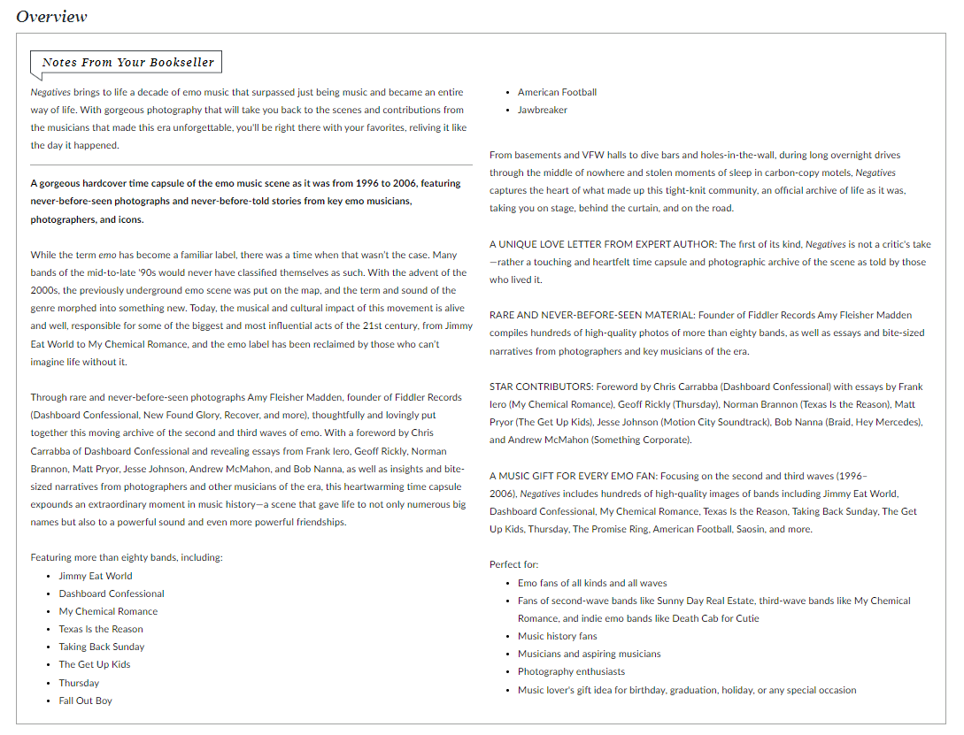 A gorgeous hardcover time capsule of the emo music scene as it was from 1996 to 2006, featuring never-before-seen photographs and never-before-told stories from key emo musicians, photographers, and icons.