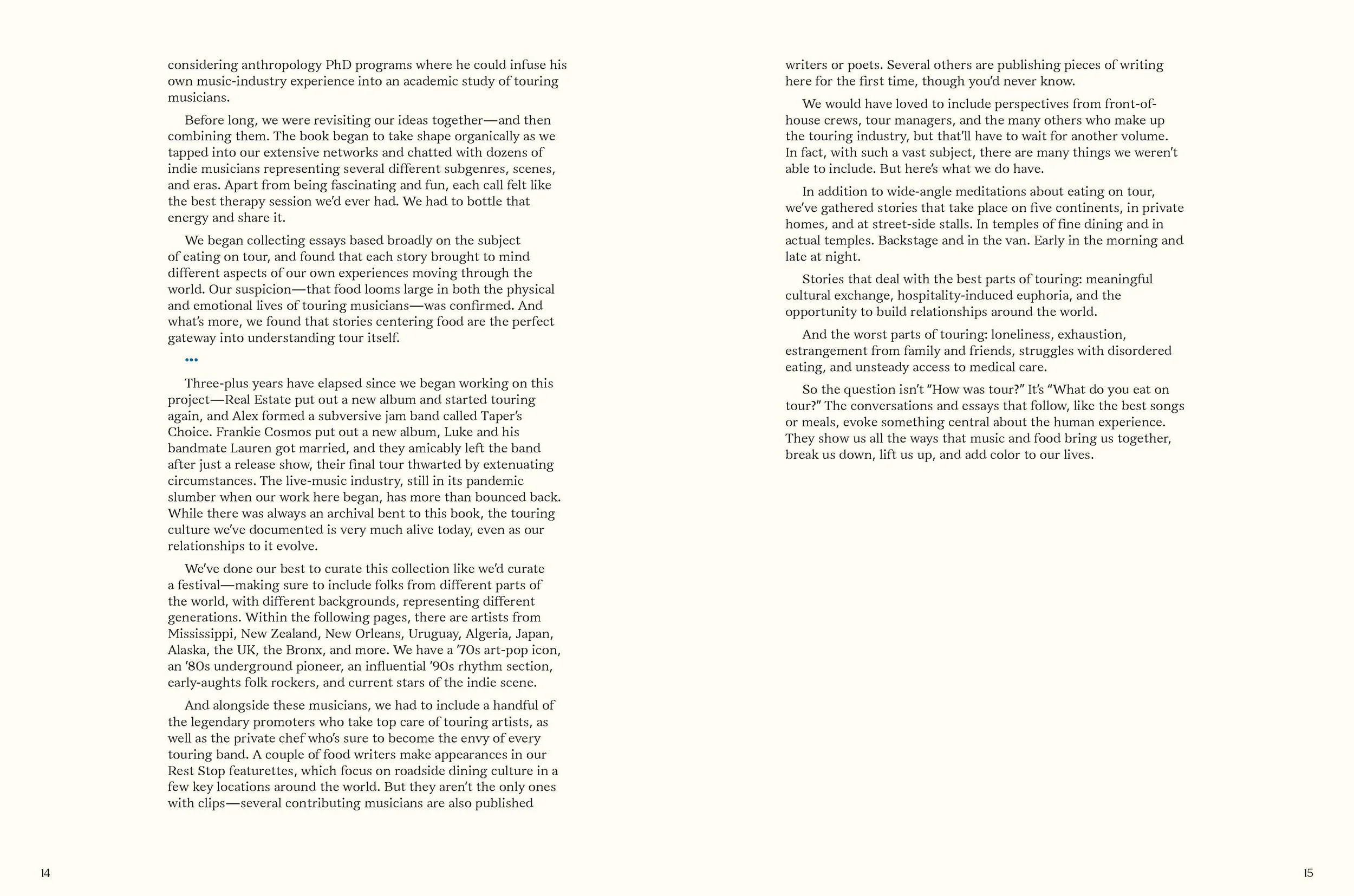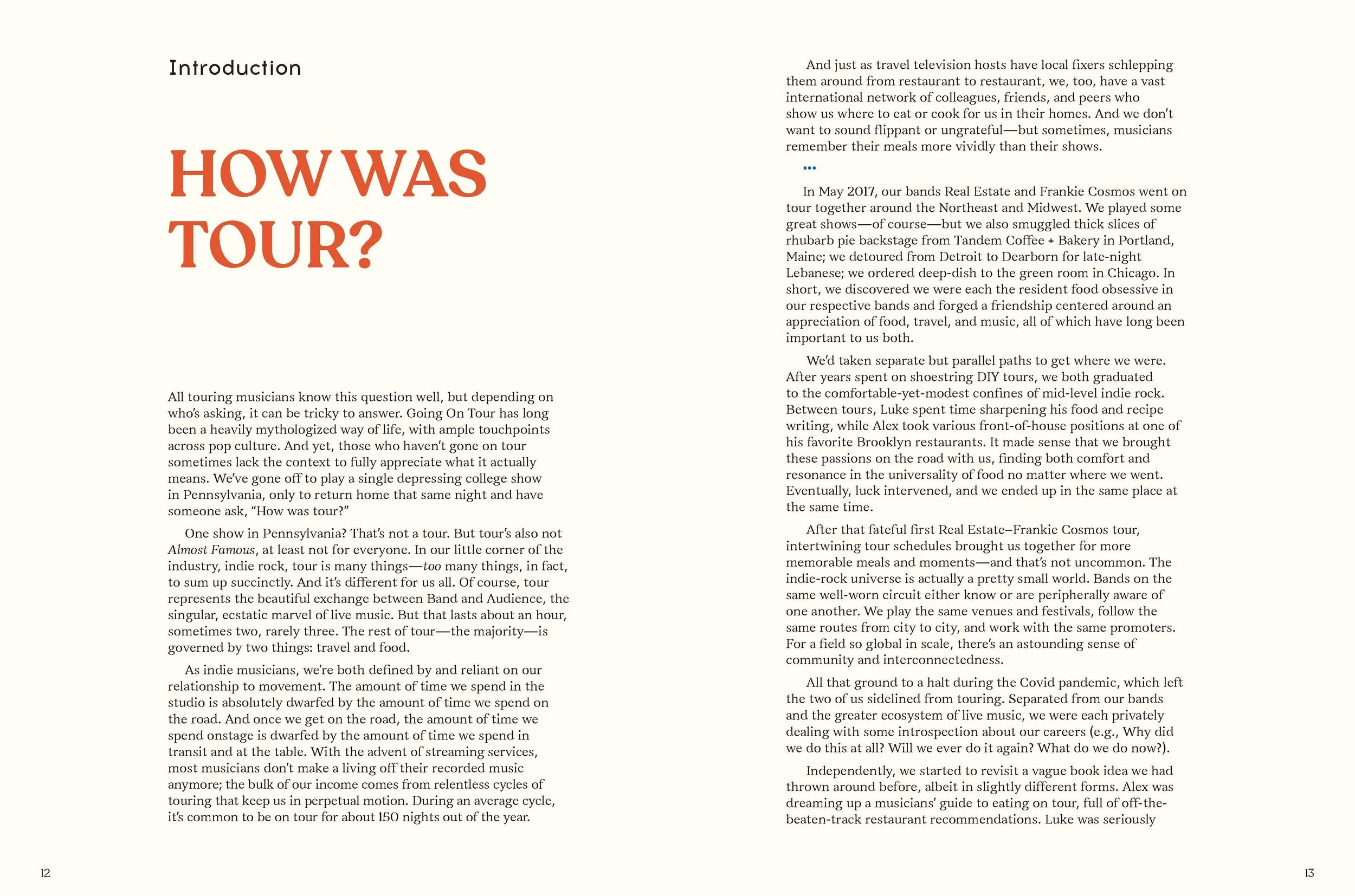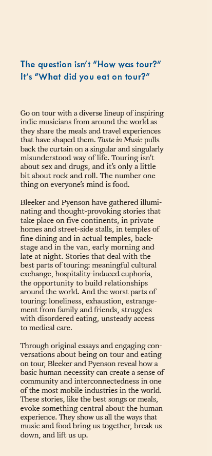 In this unique and deeply thoughtful collection, musician Alex Bleeker (Real Estate) and food and travel journalist Luke Pyenson (formerly of Frankie Cosmos) take readers on tour with a diverse lineup of inspiring indie musicians from around the world, sharing meals and travel experiences, peeking behind the curtain at this singular and singularly misunderstood way of life.